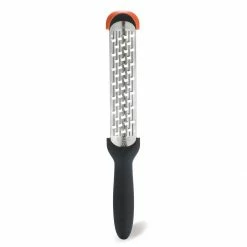 Featuring Cuisipro’s unique Surface Glide Technology, the Cuisipro Coarse Rasp Grater enables you to quickly and easily grate carrots for a salad, cheese for an omelette, or chilled butter for a pastry dough! Shallow grooves along the double-sided acid-etched cutting surface reduce resistance and extend blade length providing more cuts with each pass so you can get more done with less effort. An ergonomic handle design offers comfort and control while the non-slip foot provides stability when grating on countertops or cutting boards. With a durable steel frame surrounding the stainless steel cutting surface, the Coarse Rasp Grater is sturdy enough for a wide range of grating tasks. The clear plastic protective cover slides on the grater for safe storage, but can also be reversed to collect and measure food while you are grating so you always get just the right amount. Dishwasher safe, but hand-washing is recommended.