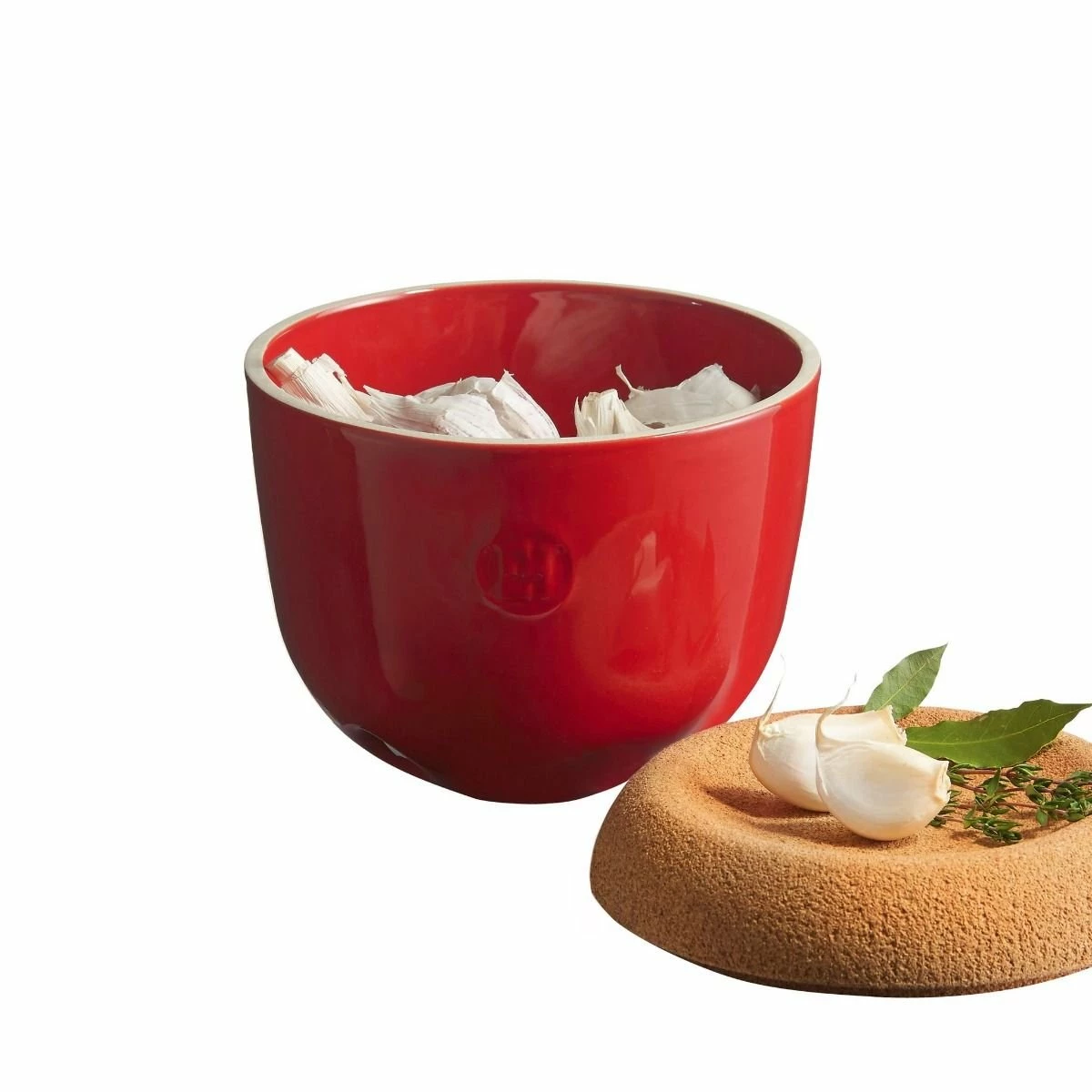 Keep garlic bulbs fresh and ready to use with the Emile Henry Garlic Pot in Burgundy. This garlic pot is crafted with Emile Henryβs high-quality refractory ceramic thatβs resistant to chipping, scratching, and fading, ensuring your garlic pot stays beautiful after years of use. With an antimicrobial and hypoallergenic cork lid and ventilation holes in the base, this pot absorbs moisture and will keep your whole heads of garlic fresh for several weeks or longer. This beautiful garlic pot is perfect for keeping on your kitchen counter so itβs always at hand when cooking, and can also be stacked with the Emile Henry Salt Cellar for space-saving storage. Add enhanced flavor to your favorite recipes with garden-fresh garlic with the Emile Henry Garlic Pot today!