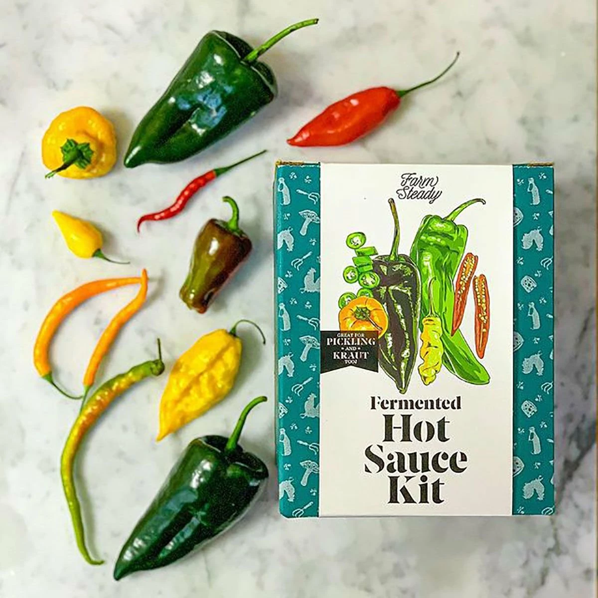 Plus, it’s easy to make! Simply add peppers & other ingredients like onions, garlic, & mangos to the jar, add salt & water and stir until combined, add the fermentation weight and more water until contents are submerged, then seal with the lid & airlock. After it’s fermented for 2-3 weeks, blend until smooth, add a little vinegar to taste, & enjoy! Your homemade hot sauce will keep for at least 2 months when stored in the refrigerator. Make a mango habanero sauce, cilantro chili lime sauce, or come up with your own creations to drizzle over pizza & tacos, add to dips & sauces, or toss with buffalo wings! The FarmSteady Kits are a fun way to spend some quality time in the kitchen and make a great gift for cooks of any skill level!