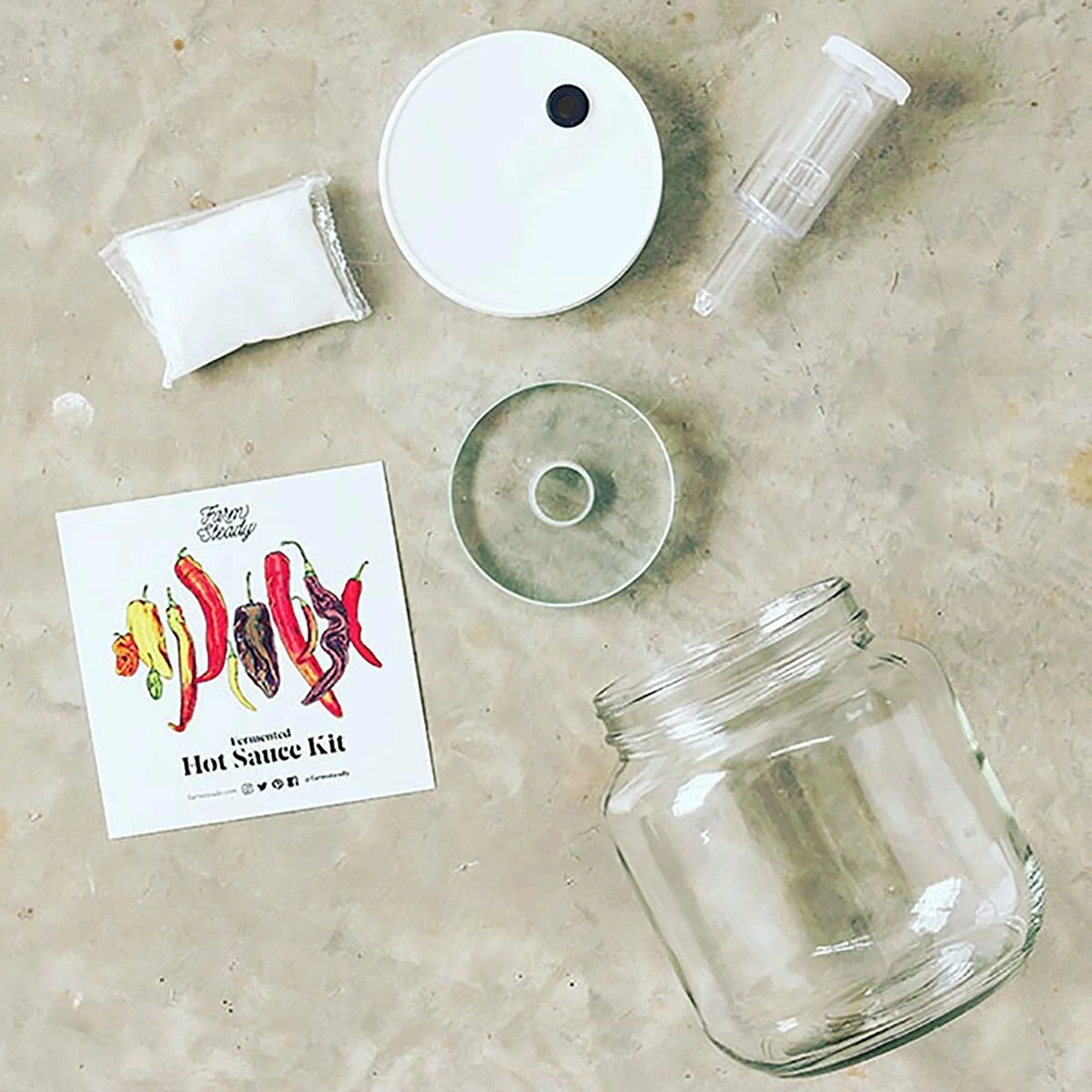 Create your own bold hot sauce personalized with your favorite peppers, flavors, & spices with the FarmSteady Fermented Hot Sauce Kit! This kit includes the essential tools for making homemade hot sauce, including a 1/2 gallon glass fermenting jar, an airtight lid & airlock, a glass fermentation weight, & kosher salt. Compared to non-fermented hot sauces, fermented hot sauces produce a more complex flavor and contain probiotics that help maintain a healthy gut. Making your own fermented hot sauce also gives you complete control over the flavor profile, salt content, & spice level, allowing you to craft a perfectly personalized batch of hot sauce tailored to your exact liking.