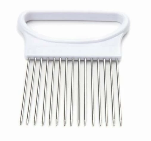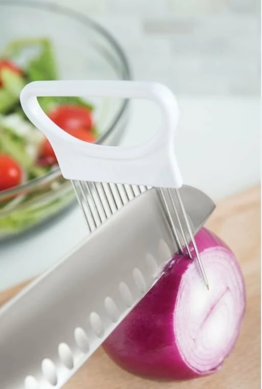 Easily make thin, uniform slices of onion with Fox Runβs Onion Holder! The stainless steel tines on this holder spear onions for a secure hold, keeping your fingers away from the knife, and preventing aromatic onion odors from clinging to your hands. The sturdy plastic handle holds up to frequent use, and when youβre finished cooking, cleanup is simple β simply slide it into the dishwasher! Use this onion holder to make thin slices of onion for burger toppings, to make perfectly uniform onion rings, and to keep your fingers safe while you slice or dice onion for recipes.