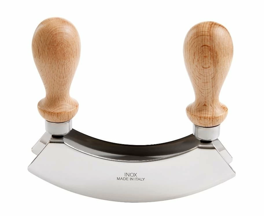 Chop and mince your favorite herbs and fruits for well-seasoned pasta, miso soup, fruit salads, and more with Fante’s Aunt Marisa’s Double Mezzaluna Rocking Chopper / Mincer! The twin blade design chops ingredients quickly and thoroughly to shorten the time spent on food preparation. With durable stainless steel and beautiful beechwood handles, this authentic Italian-made piece is fantastic for adding a flair of style to your homemade meals! Fante’s Aunt Marisa’s Double Mezzaluna Rocking Chopper / Mincer is fun for family baking projects or experimenting with gourmet recipes!