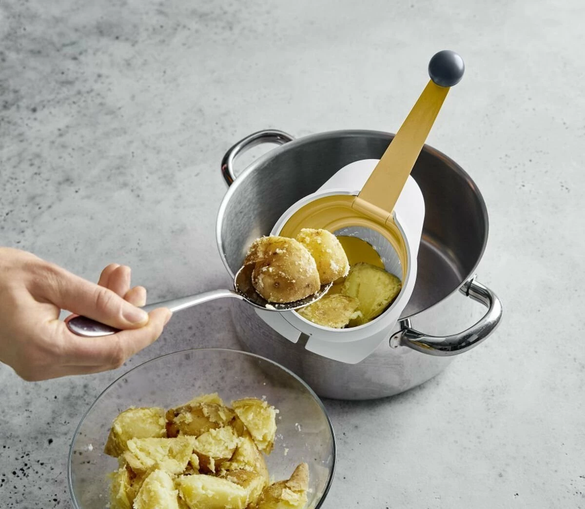 Making velvety mashed potatoes just got a whole lot easier with the Betty Bossi Potato Ricer. This isnβt just another basic potato ricer, this unique gadget actually peels the potatoes for you, making it easier than ever before to create mashed potatoes that will leave all your friends and family drooling! Simply slice potatoes, boil them, and then spoon them into the Betty Bossi Potato Ricer. This ricer actually features a lip so that it rests onto your bowl or pot so you can, with the turn of the handle, rice them directly into your serverware of choice! The unique design works the potatoes through a chute that catches your potato skins and only expels your velvety mashed potatoes. Donβt struggle with making the perfected mashed potatoes ever again, get the Kuhn Rikon Betty Bossi Potato Ricer today!Β