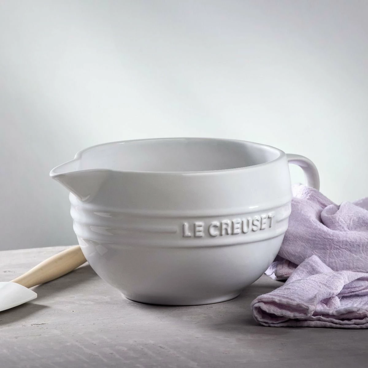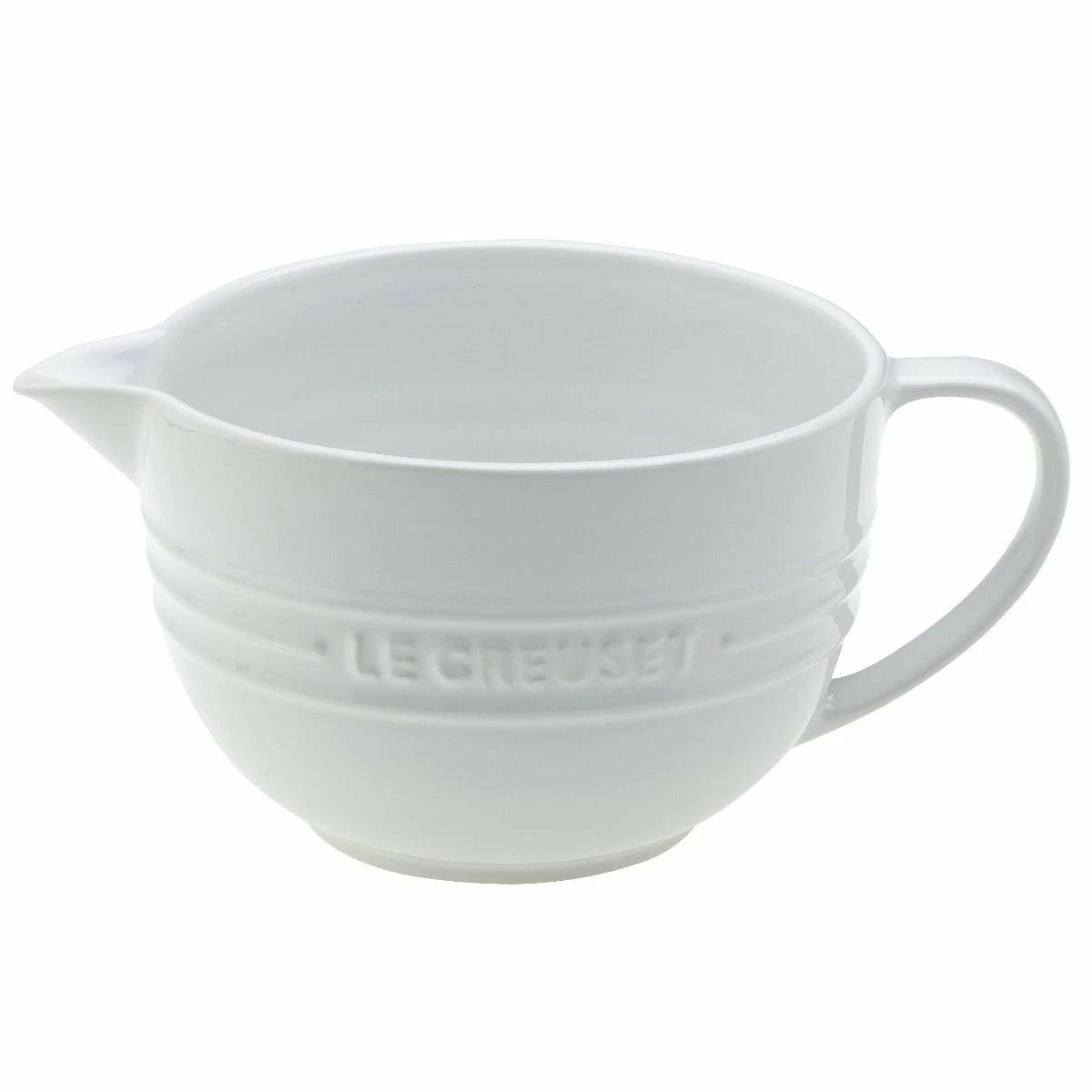 This 2 quart batter pitcher is perfect for mixing batters of all kinds from pancakes to waffles to cupcakes. Use thisย crisp clean whiteย batter dispenser to fill up cupcake pans, skillets, and waffle irons with less drips and less mess thanks to its deep pouring spout and dishwasher safe enamel finish. The enameled finish gives the Le Creuset batter bowl added strength resisting scratching from metal and staining. Le Creuset Stoneware is hand crafted make each piece a one of a kind batter pitcher.