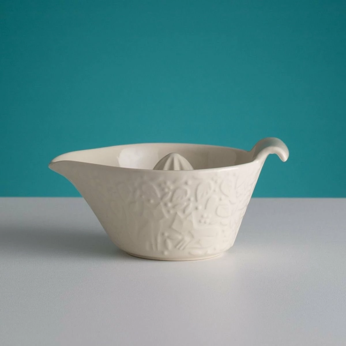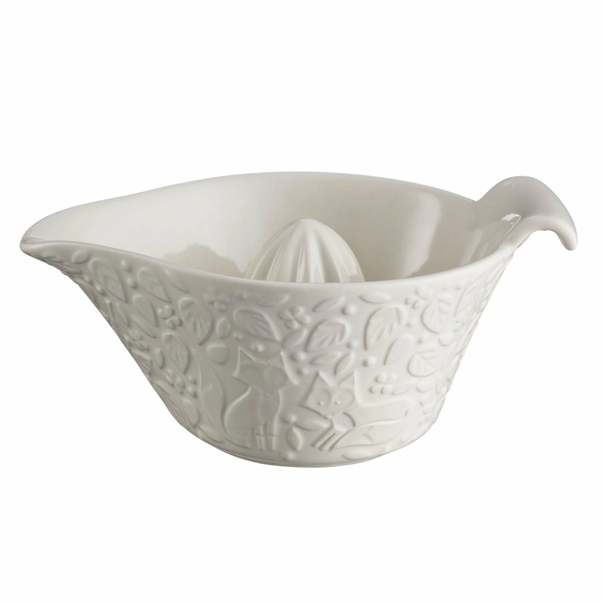 Natureβs sweet supply! When everyday tasks have you going around on empty, itβs important to just take it easy with a big glass of freshly squeezed orange juice collected inside the Cream In the Forest Juicer by Mason Cash. A jar is good but a juicer is better, and with a convenient handle in the back and lip in the front to make the process even easier. Depicted on the exterior, an embossed tranquil forest scene inspired by imaginative folk tales blossoms vibrantly all around for you to see and feel. Of durable stoneware, the honey pot resists scratches and chips that may occur from constant use. So, enjoy the all-natural flavor of fruit juice poured directly from the Mason Cash In the Forest Juicer.