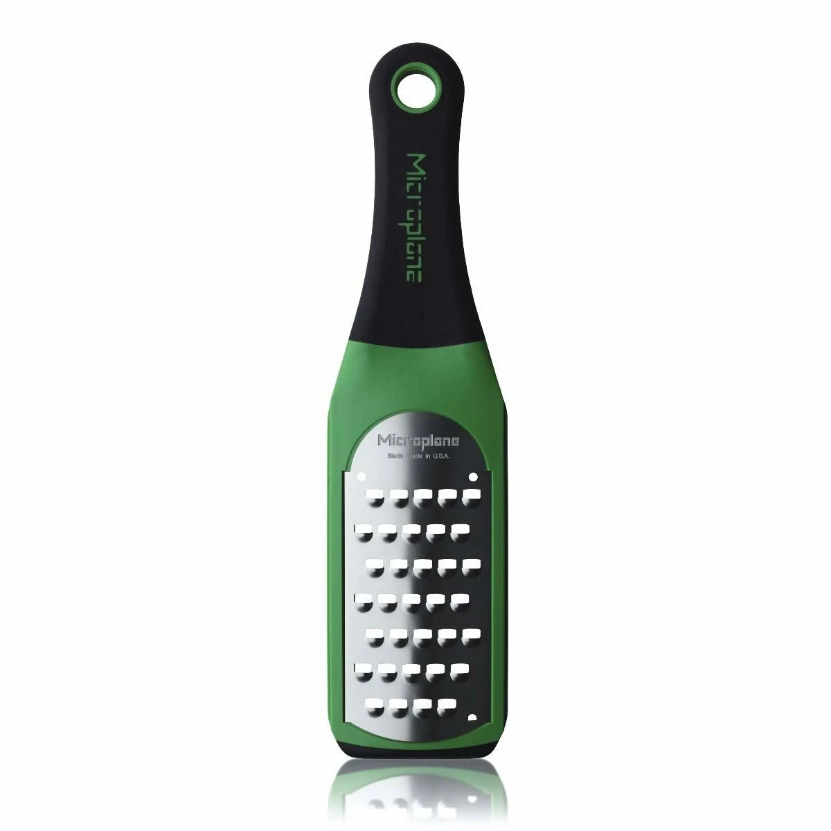 The Artisan Series from Microplane is a contemporary addition to our collection of paddle shaped Cheese Graters. The expansive surface area offers ample space to make fast work out of zesting, and grating. Each Cheese Grater has an 18/8 stainless steel Microplane blade, and soft touch ergonomic handle. Rubber feet add stability and protect your plates and counters. The Artisan extra coarse Cheese Graters are perfect for grating soft and hard cheeses, shredding carrots, zucchini, apples and onions, and softens butter.