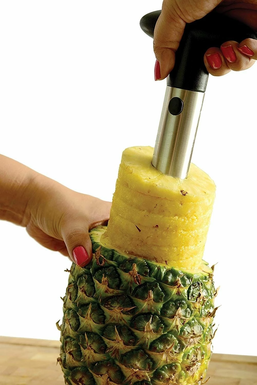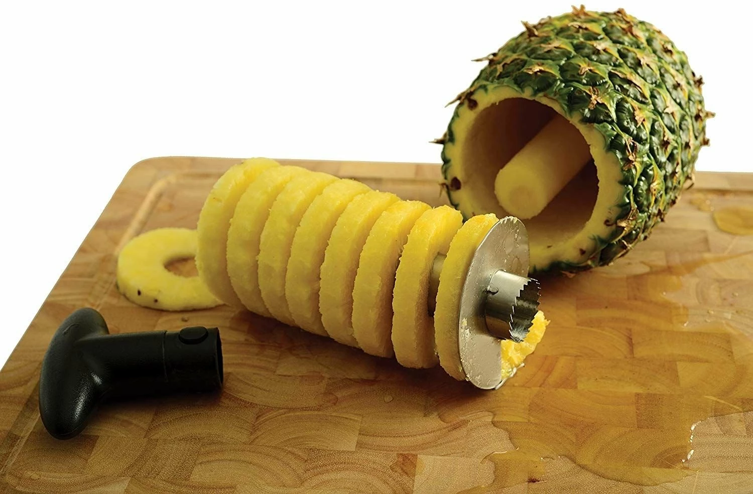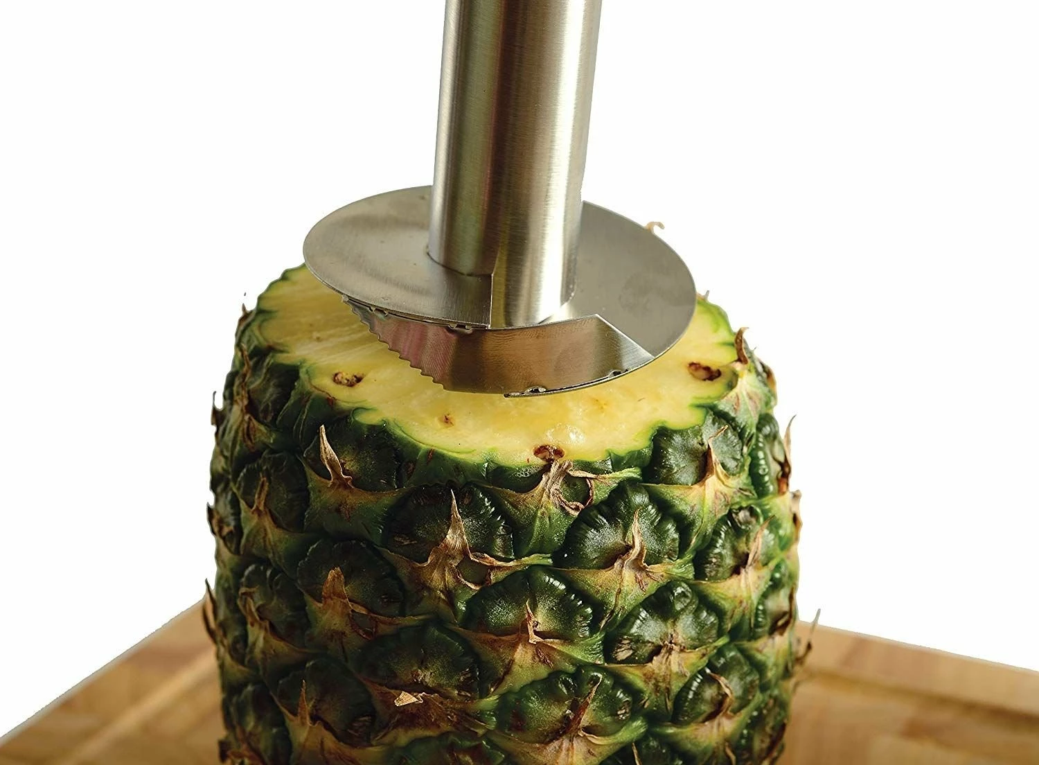 Get to the sweet, juicy fruit inside that knobby pineapple quickly, easily and without the mess with the Norpro Stainless Steel Pineapple Corer-Slicer. This compact 3.5” stainless steel pineapple corer lets you effortlessly remove the core and slice the pineapple with just a few quick handle turns, producing perfect pineapple rings ready to be sliced, diced, crushed or pureed. Prep fresh pineapple for delicious pineapple upside-down cake, nutritious smoothies, refreshing drinks and frozen desserts, or a traditional fruit salad with such ease, you’ll never buy canned pineapple again.