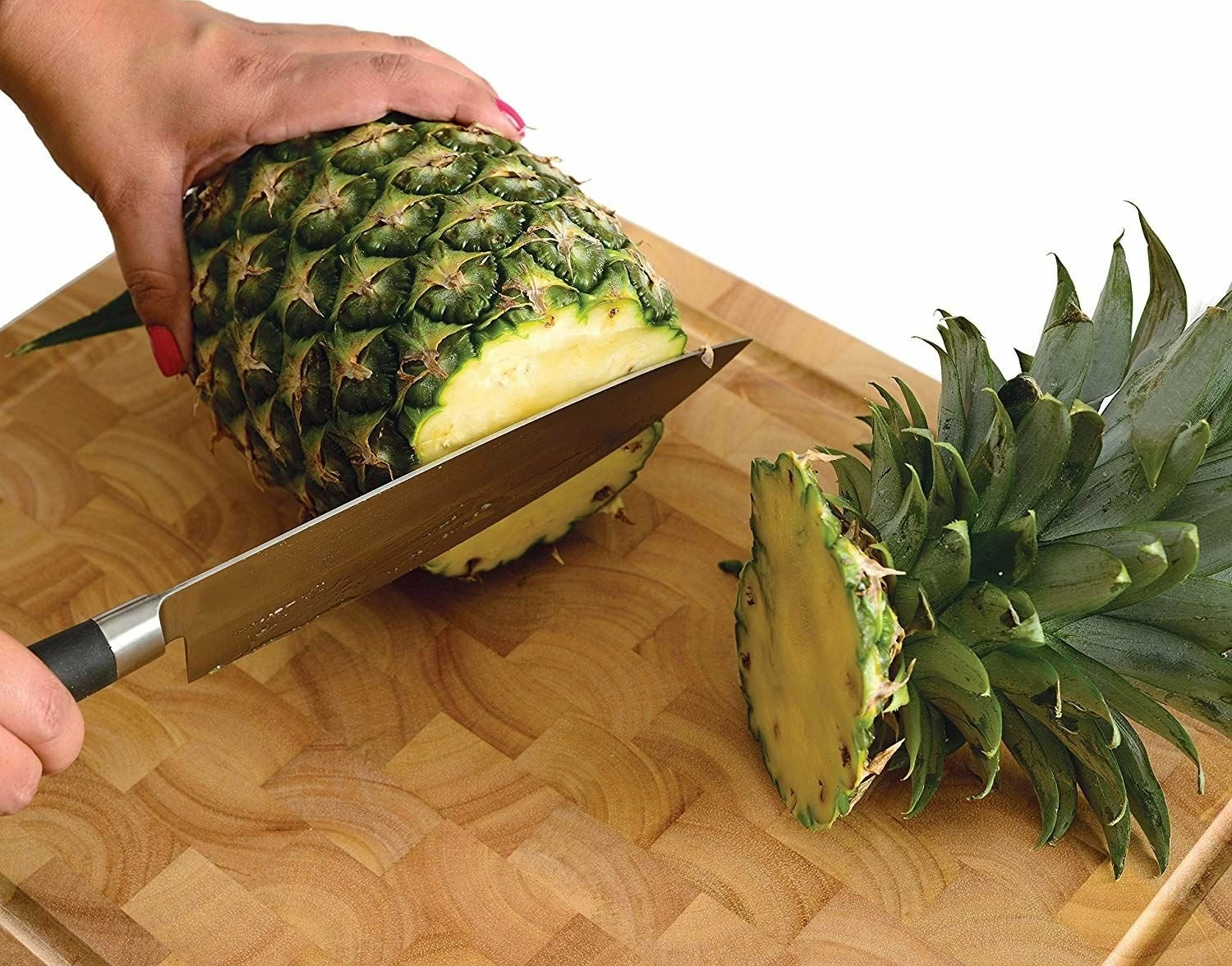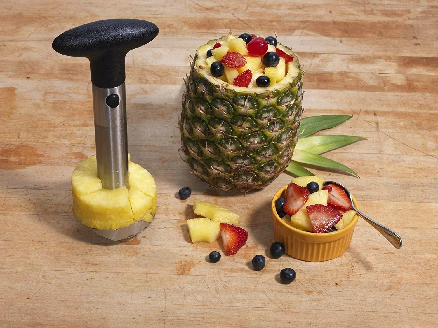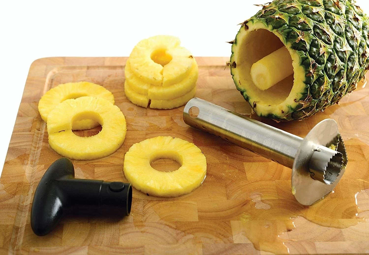Get to the sweet, juicy fruit inside that knobby pineapple quickly, easily and without the mess with the Norpro Stainless Steel Pineapple Corer-Slicer. This compact 3.5” stainless steel pineapple corer lets you effortlessly remove the core and slice the pineapple with just a few quick handle turns, producing perfect pineapple rings ready to be sliced, diced, crushed or pureed. Prep fresh pineapple for delicious pineapple upside-down cake, nutritious smoothies, refreshing drinks and frozen desserts, or a traditional fruit salad with such ease, you’ll never buy canned pineapple again.