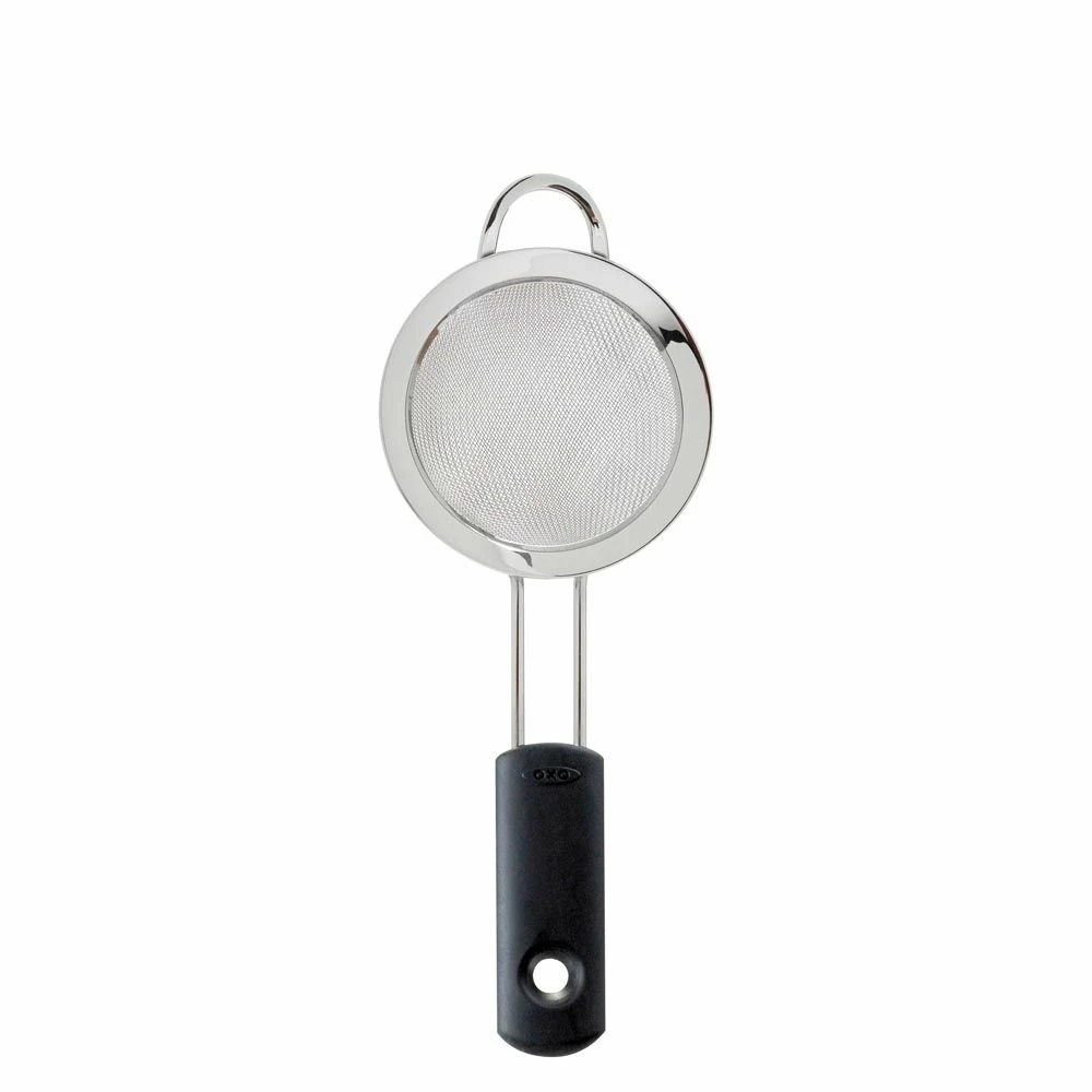 Dust sugar to put the final touch on a gingerbread house or strain tea leaves for an afternoon work intermission with the OXO mini strainer. The soft, non-slip handle gives you added confidence when dusting confections. The dishwasher safe stainless fine mesh filters leaves, pulp, or herbs and balances itself over a cup or glass. OXO delivers its promise of easy to use tools with this 3โ mini strainer.