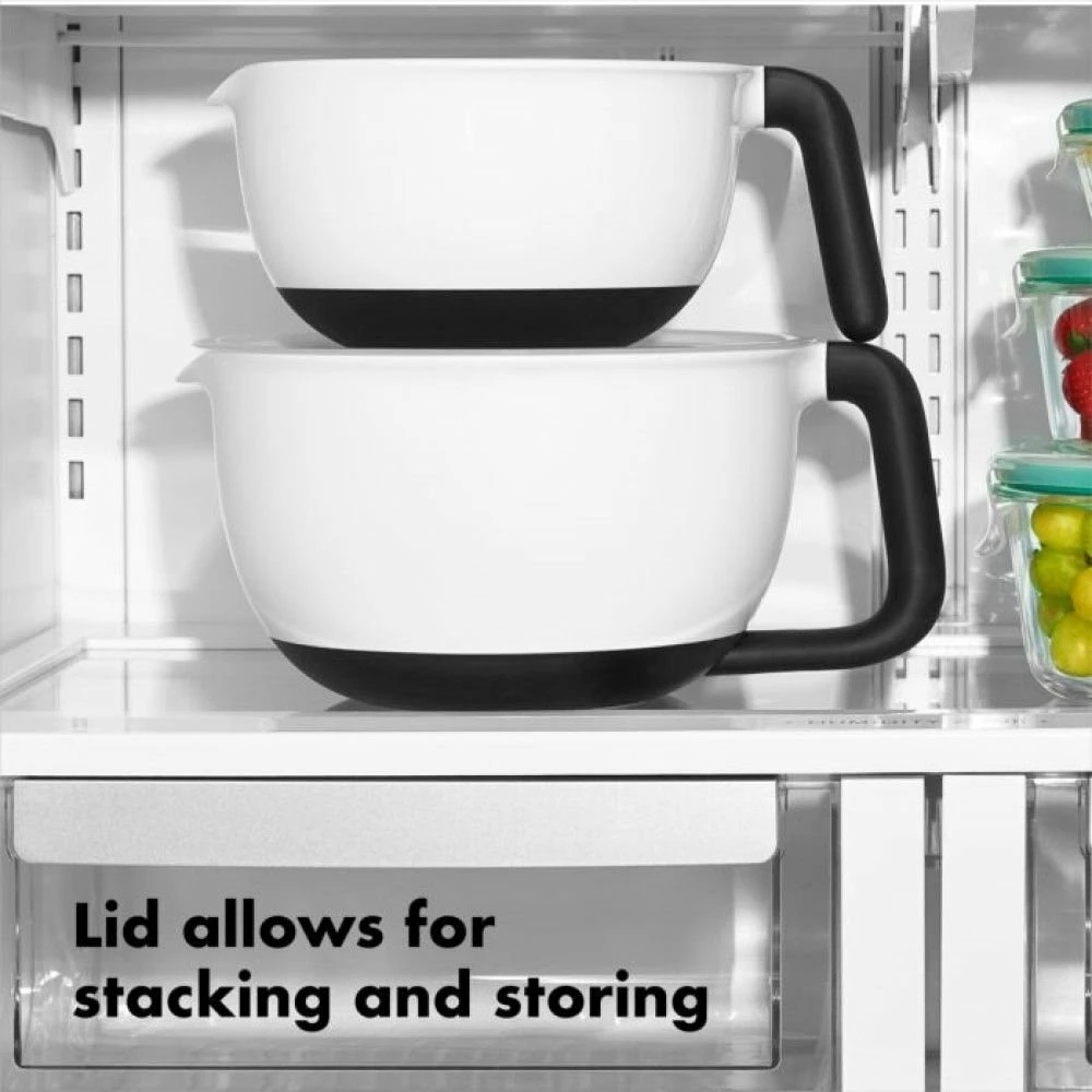 - Lid allows you to cover the bowl and stack things on top in the fridge
