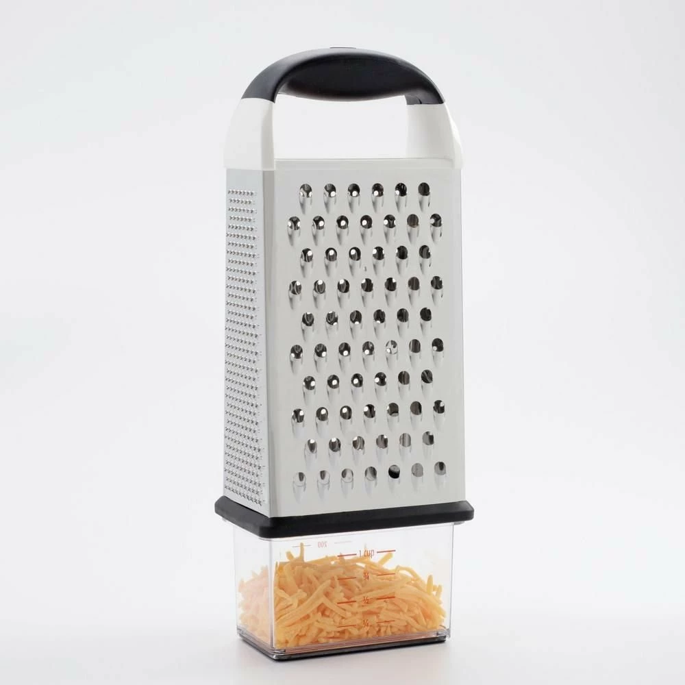 Finely grate ginger, make coarse or medium-coarse shreds of cheese, or evenly slice zucchini with OXOβs Box Grater. This 4-sided box grater has 4 different stainless steel surfaces that let you produce the exact slice or shred your recipe needs. The wide sides of the grater have coarse and medium-coarse grating options, perfect for shredding cheese for toppings, making chocolate curls, or grating potato for hashbrowns. The slimmer sides of the box grater have options for fine grating (perfect for a melt-away dusting of cheese on pasta or for zesting citrus) and slicing, which is ideal for slicing vegetables or shaving parmesan for a Caesar salad. The convenient container has measurement markings, plus a lid which makes it ideal for storing freshly grated ingredients. A good box grater is a must for any cook and this stainless steel one by OXO wonβt disappoint!