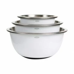 The OXO Good Grips 3-Piece Stainless Steel Mixing Bowl Set (White) keeps your countertop looking chic and your ingredients stable as you mix your favorite recipes. Made of durable and stylish stainless steel, each bowl possesses a white plastic exterior that insulates your hands from the heat or cold contained in the interior. The 1.5 Qt, 3 Qt, and 5 Qt bowls possess black non-slip bases that stabilize the container and its contents during mixing, even when tilted. Ideal for storing, marinating, and serving in addition to mixing, the set is versatile, freezer safe, and dishwasher safe. Custom designed to nest together for easy storage, these stainless steel bowls will make prep work and clean up a snap! The OXO Good Grips 3-Piece Stainless Steel Mixing Bowl Set (White) will be a tool you’ll turn to time after time.
