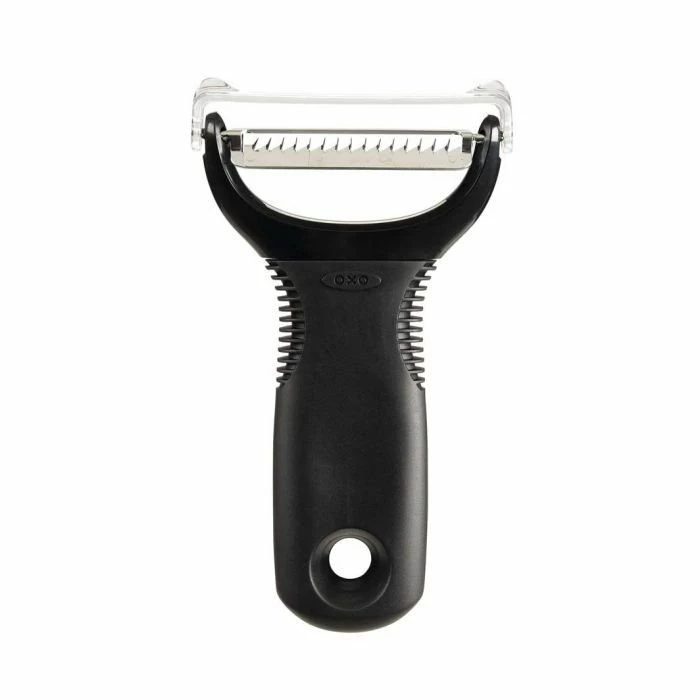 Thin like Julienne! Itβs more than like: it is Julienne! With any of your firm fruits or vegetables, professional-style strips fall away with absolute ease with the Good Grips Black Julienne Peeler by OXO. Like with any peeler, simple hold it firm and guide the blade along the edge or surface of those foods, and just like that, you have perfectly cut strips in julienne. Along the side of the black peeler, youβll see ribbed or contoured flaps designed for absolute comfort as you peel smooth, straight edges or rough, bumpy edges. Thereβs no need to learn to cut like a professional chef, not with a tool like this peeler; and with such convenience, you have the opportunity for creating delicious garnishes, salad toppings, and so much more. Just take the peeler by the soft, non-slip grip, flip the cover out of the way, and then you can start peeling away. And once youβre all done, just flip the cover back to where it belongs for easy storage. Cleaning is no different β just wipe and rinse. Some days, you just want to eat out; other days, you just want to eat in. Well, eat in with OXOβs Good Grips Black Julienne Peeler, for nothing even compares to the homemade tastes and aromas of freshly made food by your own two hands.