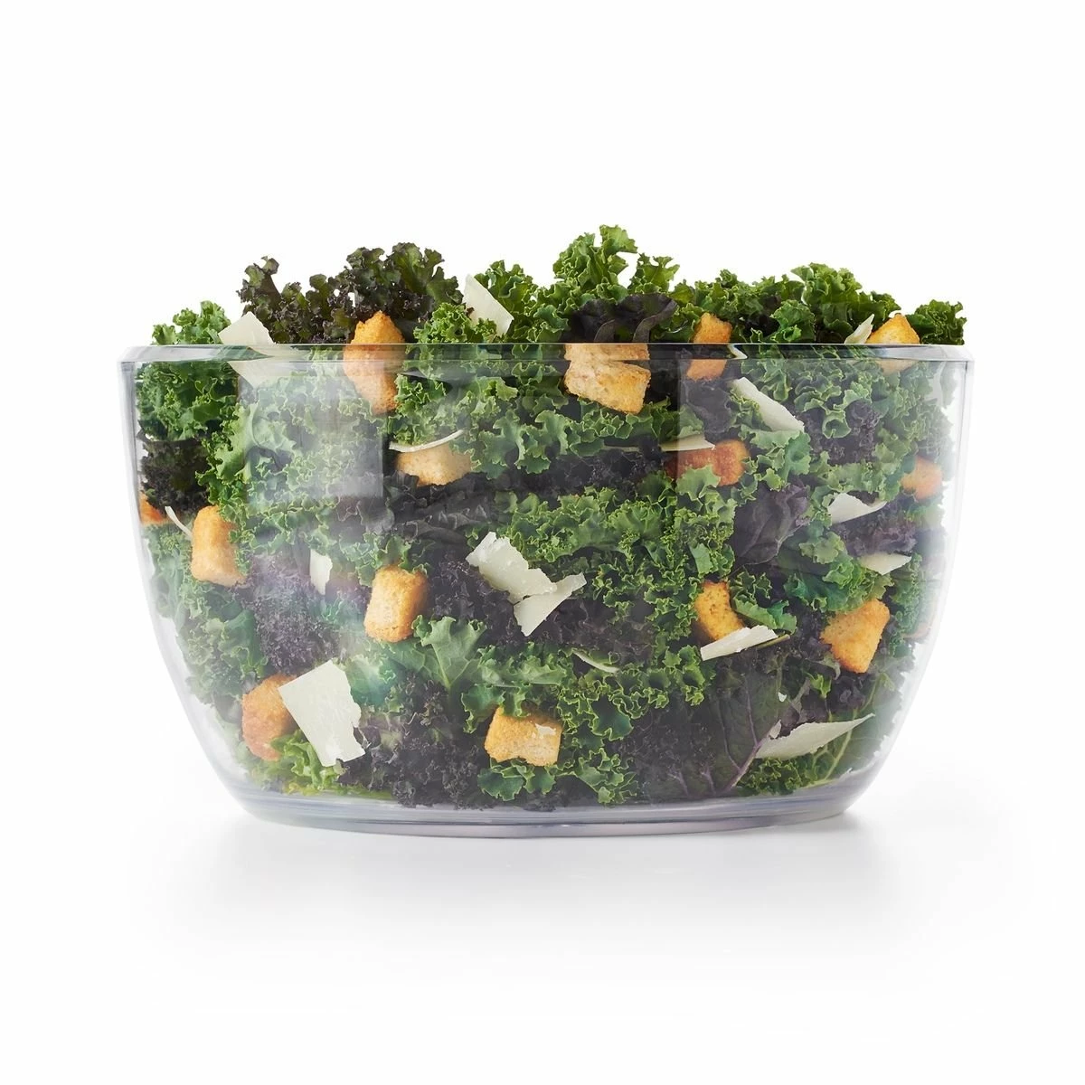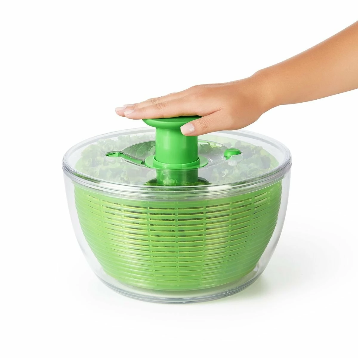 Clean your greens with just one hand with the OXO Salad Spinner in Green! With an award-winning design, this salad spinner quickly rinses leafy greens and herbs with minimal time and effort. Innovatively designed to operate much like a childβs top, it uses a simple one-handed pump to quickly dry rinsed salad. An included brake stops the spinning basket quickly. The 5-Qt basket allows you to quickly rinse lettuce and can be used as a colander separately. The stylish bowl outer bowl can be dried and used as a salad serving bowl. Long considered a kitchen necessity, OXO has added a few updated features to this Salad Spinner 4.0 to make it even better. The brake operates even faster, and the push button has a flat top, so when itβs locked into place the lid is flat, allowing for neat stacking in the cabinet. The green color makes a fun, modern addition to your kitchen. Add the OXO Salad Spinner to your kitchen and discover for yourself how easy it is to wash and dry salad greens, herbs, and hearty spinach and kale.