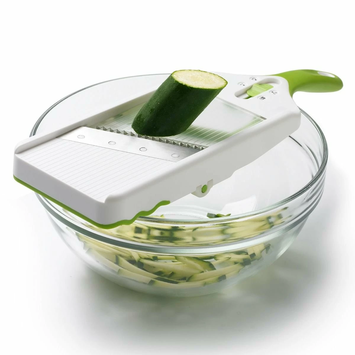 The Progressive International Julienne and Slicer has three slicing thicknesses that can be easily adjusted with your thumb. This slicer can easily transform from slicing to julienne blades. The wide surface of the julienne and slicer accommodates larger fruits and vegetables with ease. The angle of the stainless steel blade provides more efficient slicing and the non-skid ridged surface provides needed stability when using this julienne and slicer over a bowl or on a counter. There is a safety lock for storage of this julienne and slicer and a protective finger guard while in use.