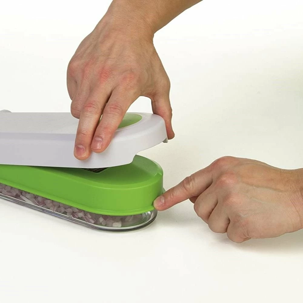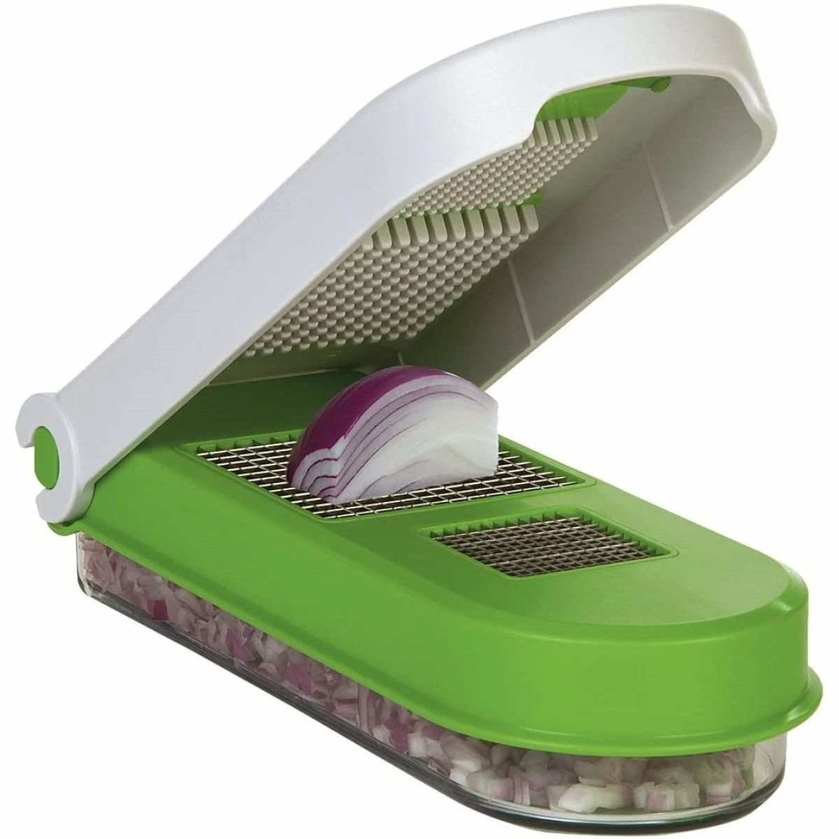 Dice onions, peppers, garlic, tomatoes and cucumbers with ease