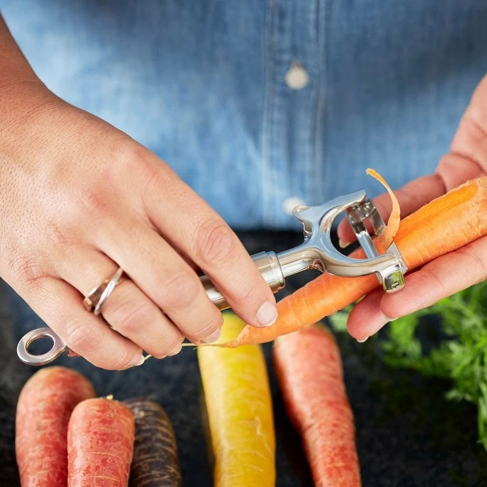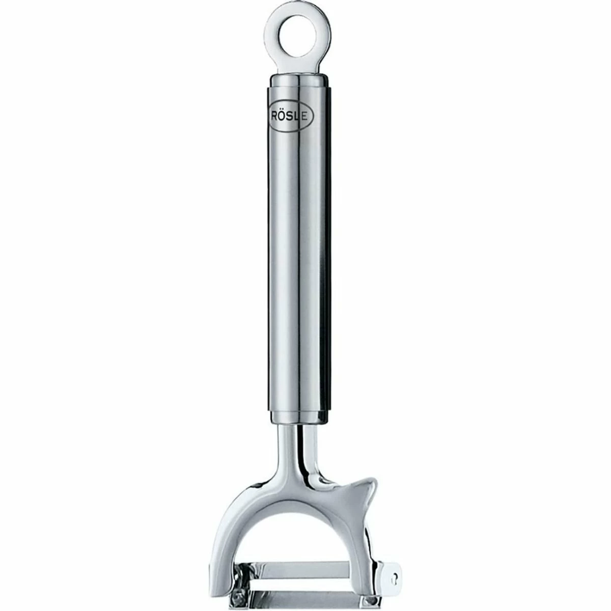 One of RΓΆsle’s superb kitchen tools, this wide fruit and vegetable peeler is suitable for both right- and left-handers and has a flexible swivel head for contouring to potatoes, carrots, apples and more. Like all RΓΆsle tools, utensils, and Open Kitchen storage components, the peeler is made of 18/10 stainless steel for rustproof beauty and long-lasting durability. The round handle has a satin finish to conceal finger marks. It’s sealed against water and has a hanging ring so the peeler can be conveniently stored on a hook in RΓΆsle’s Open Kitchen system of basic rails and Gridwalls or hung on any hook or peg. The peeler is sturdy, balanced, and exceptionally comfortable in the hand. All RΓΆsle products are dishwasher-safe, and carry a lifetime warranty against defects.Β
