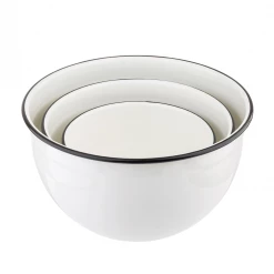 Capture the classic farmhouse look with this set of Enamel-Coated Mixing Bowls (Set of 3) from TableCraft! Whether you’re mixing ingredients for a fresh fruit cobbler, serving a crisp garden salad, or just using as a decorative touch, these durable steel bowls feature a clean white enamel finish with a black painted rim reminiscent of vintage enamelware. Heat-safe up to 500ยฐF, these bowls are induction-safe and can be used in the oven, on the stove top, and even over an open flame. They can also be chilled in the freezer and stored in the refrigerator when making fruit salads, dressings, or letting cookie dough chill. Due to the steel core beneath the versatile enamel finish, the mixing bowls are not suitable for any use in the microwave. The set includes three bowls, (1) 5.25 Qt, (1) 3.25 Qt, and (1) 1.625 Qt, that nest within each other for compact storage and all of the bowls are dishwasher-safe for easy cleanup.