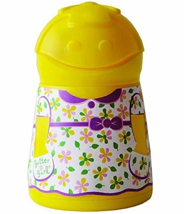*A photo above depicts Butter Girl with a purple frame wearing an apron. This is a former design. Butter Girl is now only available in yellow with the the floral dress outfit, which is a sticker and must be removed between washes.